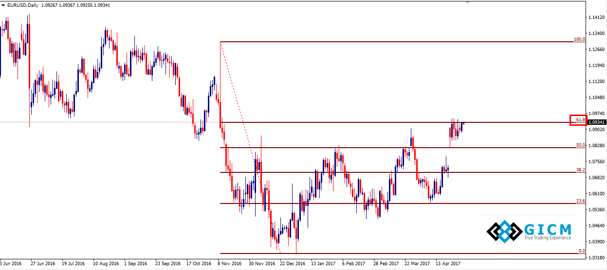 The break above the trend line depends on the tone of the Fed policy statement. The CME data shows the June rate hike probability stands at 70%. This means a hint of a June rate hike would not shock markets, but nevertheless could yield a US dollar rally.